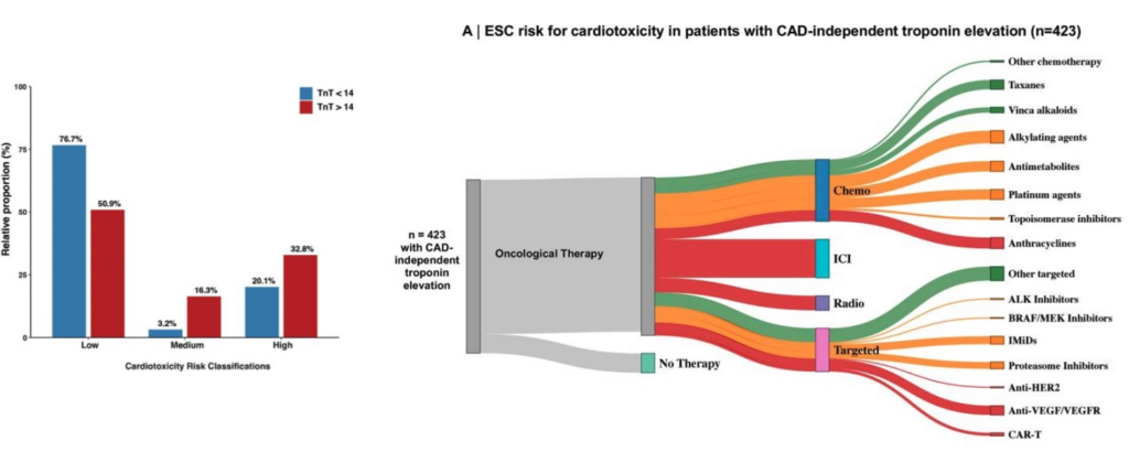 Ein entscheidendes Finding ist die Erhöhung des Troponin bei Patienten mit erhöhtem ESC-Risiko für kardiovaskuläre Nebenwirkungen onkologischer Therapien. Ca. 10% von asymptomatischen Patienten mit erhöhtem Troponin-T hatten eine interventionsbedürftige Koronare Herzerkrankung. Für diese Patienten gelten die ‚klassischen‘ Risikofaktoren wir Rauchen, und erhöhter BMI, sowie vorbestehende Koronare Herzerkrankung als prädiktive Marker.